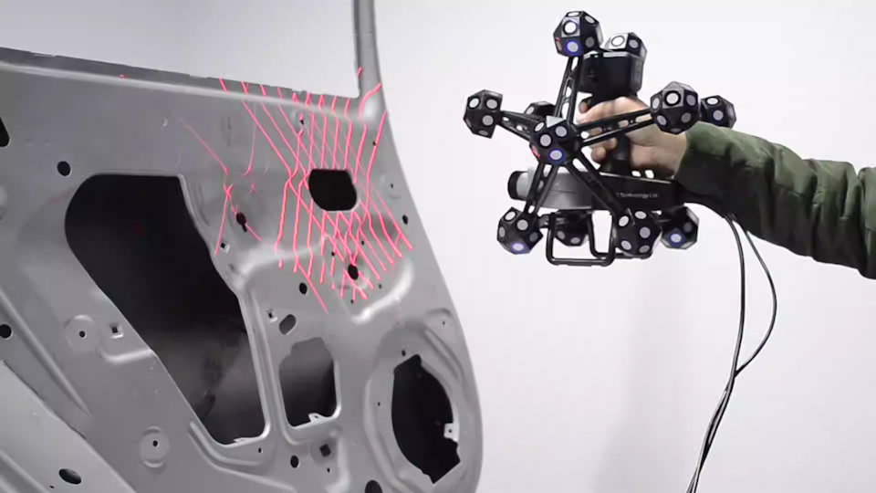 Чуть более гибким является лазерный сканер с привязкой по маркерам на самом сканере и внешних камерах, но на определение положения сканера опять тратится процессорное время и этот сканер не такой быстрый, зато в поле зрения внешней камеры можно сканировать любой объект, т.е. можно обойти условную 6 метровую машину, чего нельзя сделать с координатно-измерительной рукой.