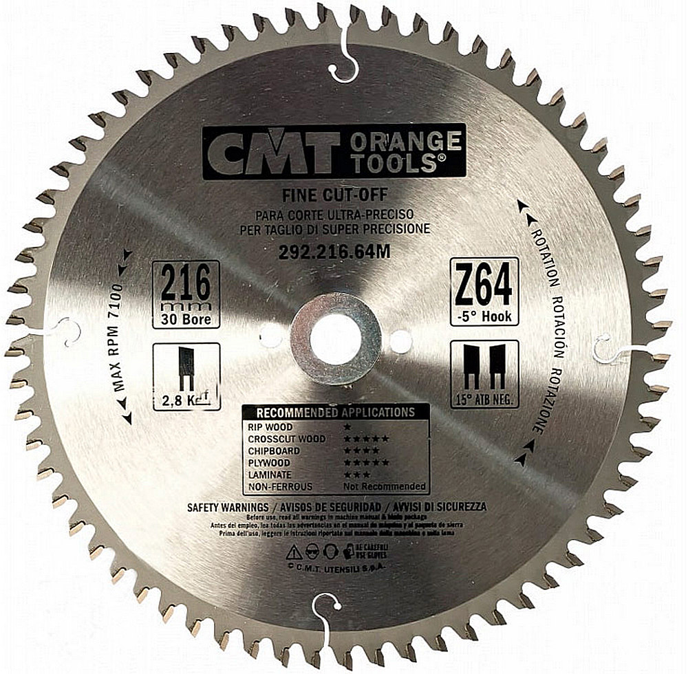 70 зубьев с широкой твердосплавной напайкой и совсем небольшим положительным углом заточки обеспечивают идеально ровные резы. Безусловно, скорость подачи материала на обработку здесь уже намного ниже, но качество получаемых заготовок – того стоит.