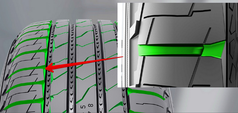 Глубокие диагональные прорези на центральных рёбрах стабилизируют управляемость в любую летнюю погоду. Стойкость к аквапланированию усиливают гидроканавки на внутреннем плече протектора и дополнительные углубления в форме волны в поперечных канавках на внешнем ребре.