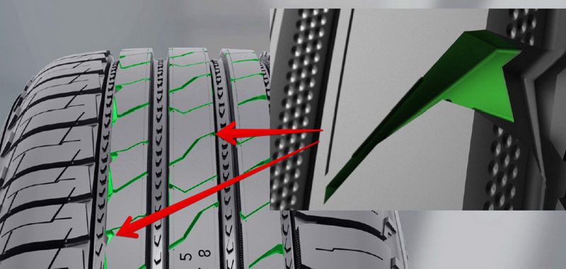 Диагональные гидроканавки в продольных рёбрах центральной зоны стабилизируют управляемость и эффективно предотвращают аквапланирование, накапливая и направляя воду в окружные каналы. Также в этой SUV-шине применена финская технология бесшумной конструкции канавок – множество мелких полусферических углублений на стенках продольных каналов, снижающих шум от потоков воздуха.