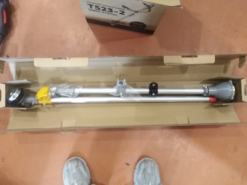 Штанга не складная, это и плюс и минус. Нельзя сложить в багажнике, но надежность такой штанги выше. Из минусов забивается трава под катушку, я решил это следующим образом, снял металлическую чашку и поставил прижимное кольцо для ножа из комплекта. Теперь все в порядке. Нету на ручке газа кнопки стопора газа, нужен ли он, решать вам, для меня это не критично, тут удобная гашетка газа. Сбруя дрянь. Лучше поменять, первое время можно погонять, но устает спина, т.к. ремень ослабляется и теряет настройки, да и тут он на одно плечо. Лучше купить двухплечевой ремень. Катушка норм, можно использовать пока не потребуется замена.