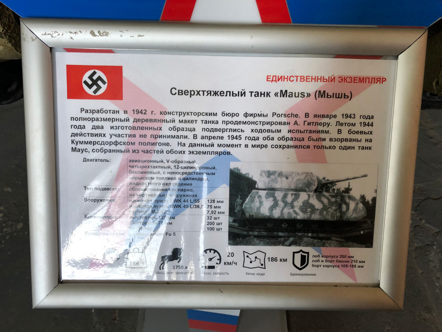 Экспозиция очень интересная. Наряду с известными машинами много впечатляющих экспериментальных образцов, чего только стоит «плод зловещего германского гения» единственный в мире танк «Маус» …