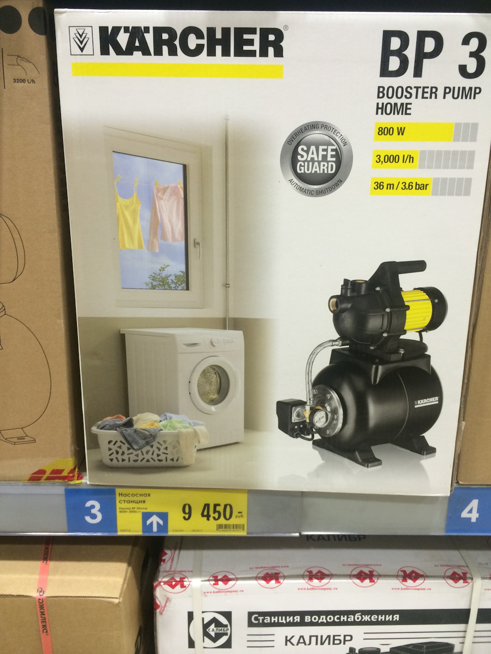 Цена: порядка 9500 руб. Эта станция — модель Karcher BP3 Home. Эта модель оснащена расширительным баком, в который насос закачивает воду до 3,5 атмосферы. Кран открываем — вода из этого бака поступает к вам. Давление падает до 2,8 Атм — насос подкачивает и догоняет ее до 3,5 Атм.