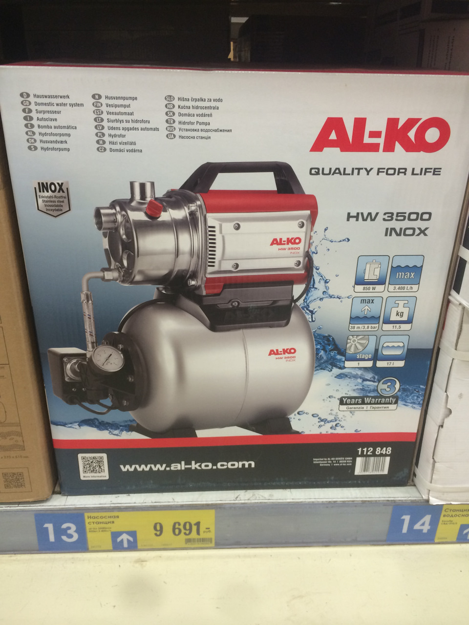 Цена: 7995. Продается только в Castorama. Mac Alister — брэнд магазина Castorama. В целом к этому брэнду я отношусь положительно, потому что в случае каких либо проблем — не надо искать сервис центр — Вы просто несете станцию в магазин (фактически — на завод) и они с ней разбираются. Мое положительное отношение к данному брэнду основано на том, что под данным брэндом выпускается очень многопродукции: насосы такие, насосы сякие, электро инструмент и так далее. И очень привлекательная цена.