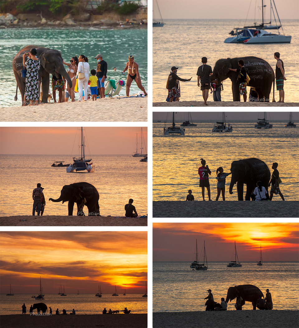 Слона приводят на пляж часам к пяти и пару часов он со свитой зарабатывает.