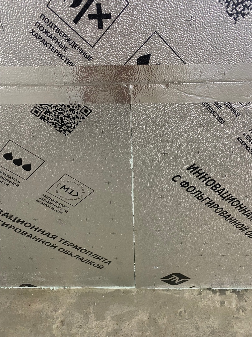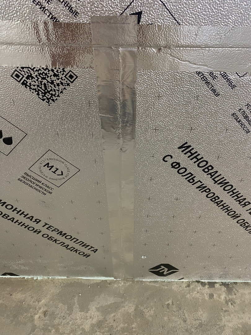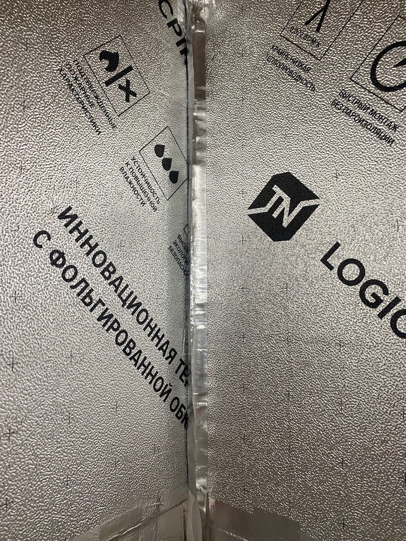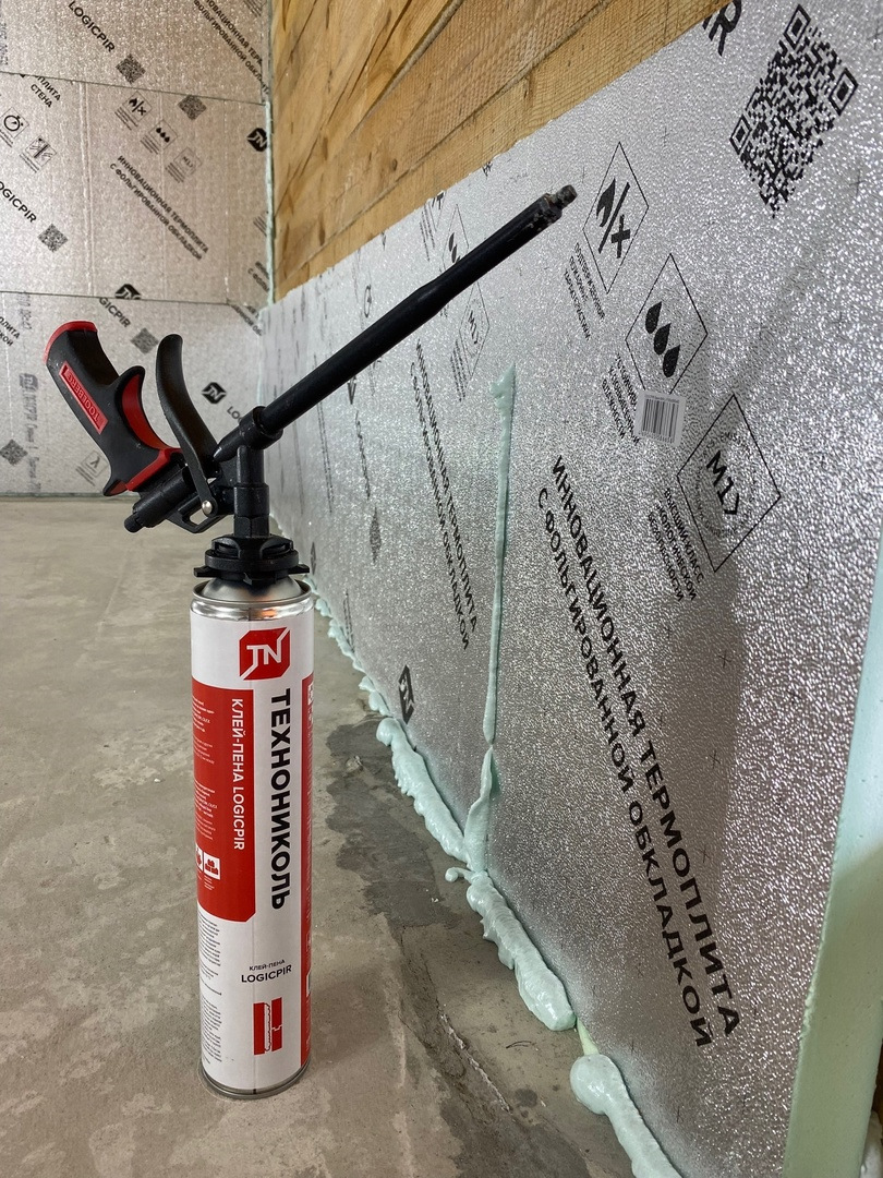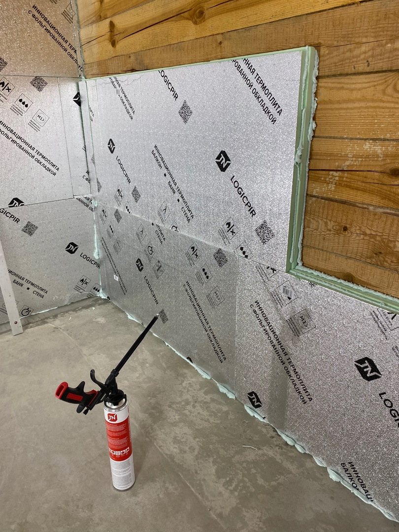 Когда распаковала термоплиты толщиной 30 мм, обнаружила, что на 4 листах изображение на фольге немного отличается (но заветное слово «баня» на них тоже присутствовало). Клей-пена LOGICPIR находится в стандартных сменных баллонах для пистолета для нанесения монтажной пены.
