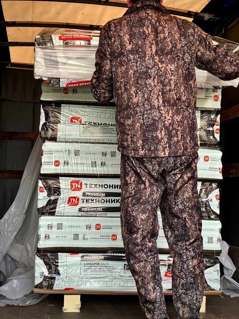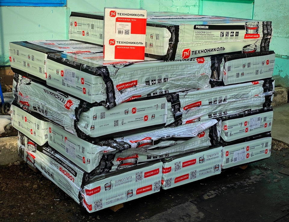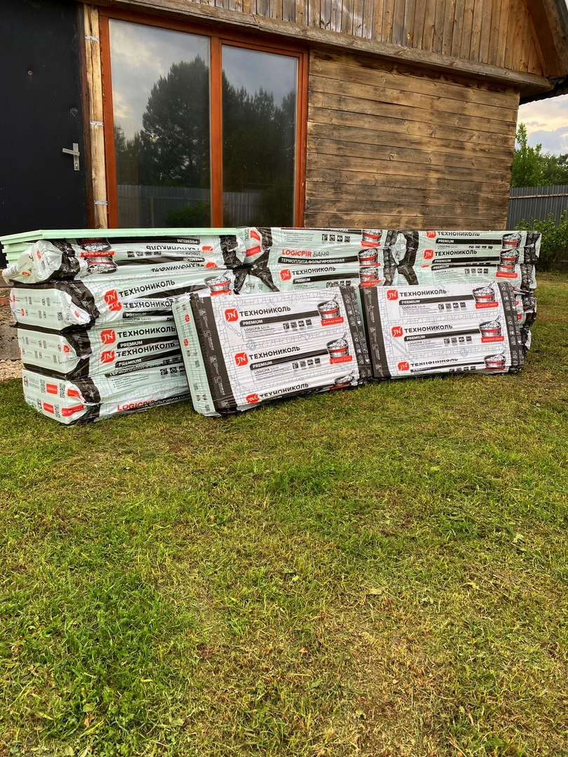- термоплиты LOGICPIR Баня от ТЕХНОНИКОЛЬ — 8 упаковок. Из них 7 упаковок по 5 термоплит 585×1185 мм, толщиной 50 мм и одна упаковка с термоплитами толщиной 30 мм (8 шт. в упаковке);