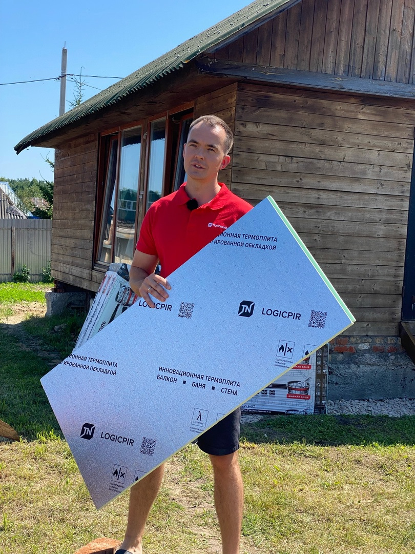Про необходимость защиты термоплит от солнечных лучей я была осведомлена — на каждой упаковке имелась этикетка, на которой черным по белому написано «Хранение термоплит LOGICPIR на открытой площадке осуществляется только в заводской упаковке». Поэтому материалы из вскрытой упаковки я сразу занесла в темноту — внутрь сруба, а остальное разместила на веранде. Но просмотрела, что на одной из упаковок пленка немного разошлась и обнажила кусочек теплоизоляционной плиты, и за короткое время эта часть пожелтела. Так что при хранении на улице нужно очень внимательно осматривать заводскую упаковку на предмет повреждений и/или дополнительно термоплиты накрыть.