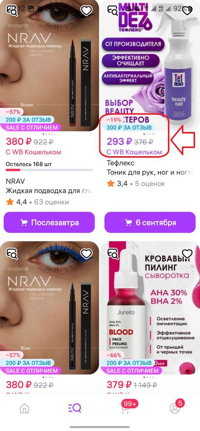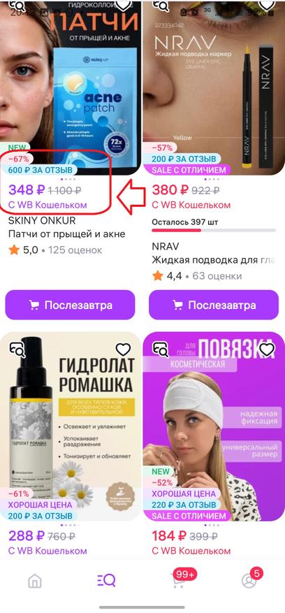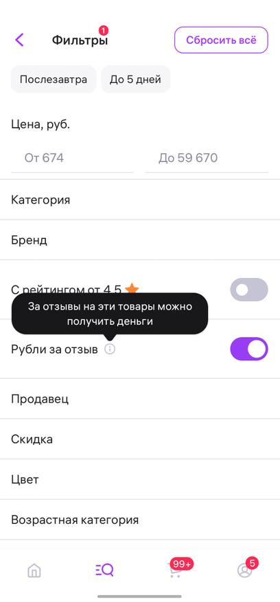 Пример аналогичного фильтра «Рубли за отзыв» в мобильном приложении. Стоит отметить, что за ряд товаров предлагается сумма возврата за отзыв больше, чем стоимость самого товара. То есть можно получать дополнительную прибыль в случаях, когда был оформлен товар, условно, за 350 рублей, а получено за отзыв — 600 рублей.
