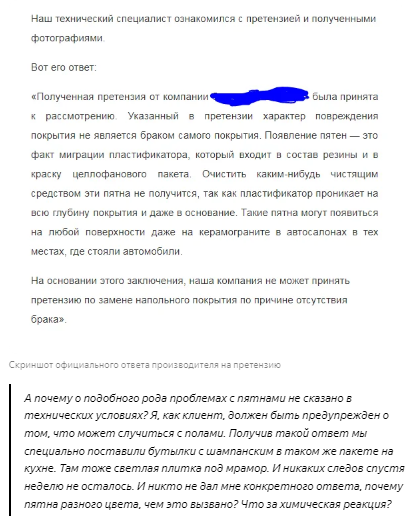 Мы, в свою очередь, торгуя напольными покрытиями и занимаясь их укладкой, также ведем свою статистику. И конечно, в наших интересах, чтобы у клиентов не возникало жалоб на полы, либо, в случае брака, чтобы поставщик заменил покрытие на новое.