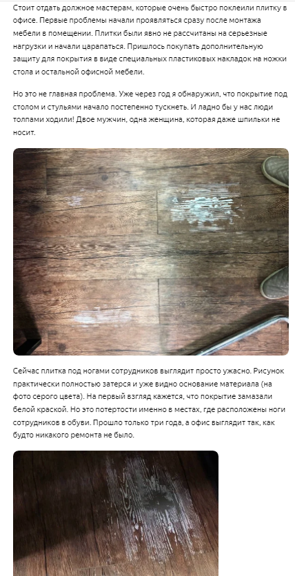 Иногда реклама говорит о том, что кварц-винилу сносу не будет не то что дома, но и в магазине. Отзыв Сергея опровергает это мнение. Мы часто можем видеть в офисах, медицинских центрах, кафе вытертые места там, где часто двигают стулья. Тут же Сергей использовал на стулья накладки, но в местах, где сотрудники ставили ноги, все равно возникли потертости.