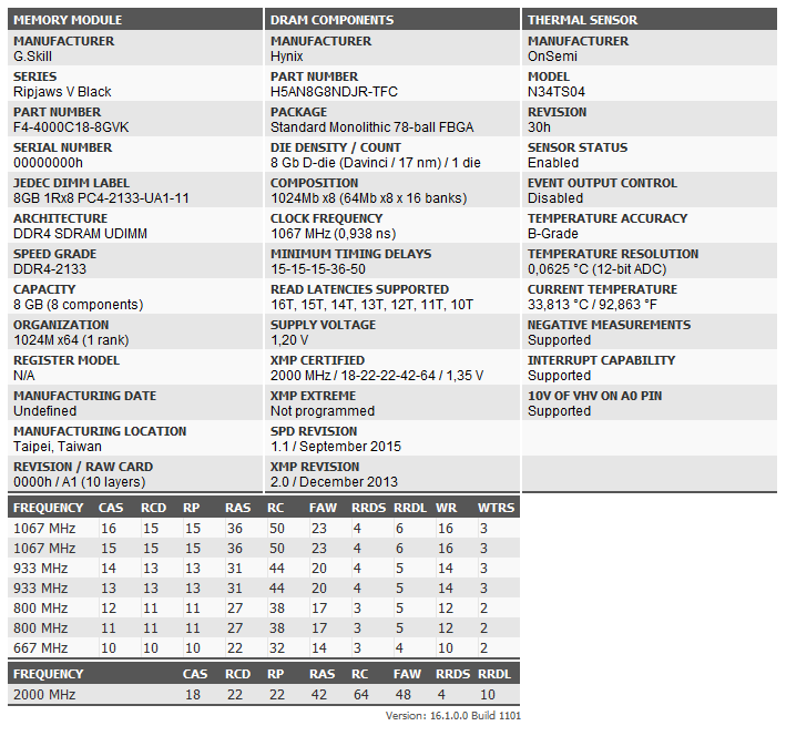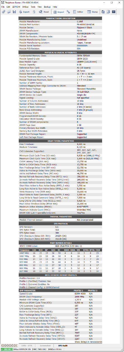 Выше приведены краткий и развернутый отчеты о технических характеристиках набора DDR4-G.Skill Ripjaws V F4-4000C18D-16GVK. Из них, например, можно узнать, что производителем самих микросхем выступает компания Hynix, так же видно, что используются новые чипы D-Die (DJR). Структура модулей одноранговая, то есть 8-гигабитных чипов размещены по одной стороне печатной платы.