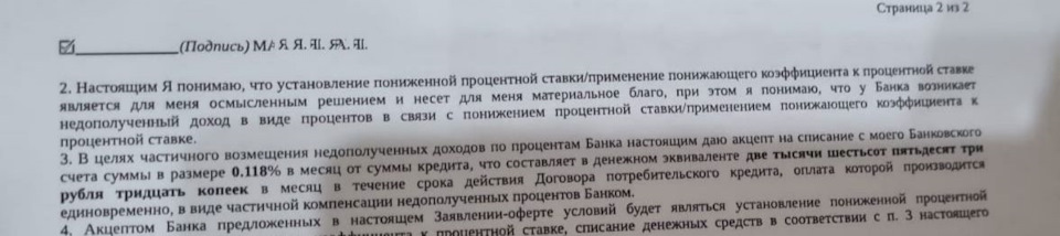Указанное дополнительное соглашение о снижении ставки (обычно пункт 3) содержит условие, по которому заемщик дает банку согласие на списание части суммы кредита на возмещение недополученных доходов банка по процентам. При этом, чтобы заемщику было труднее понять происходящее, банк не указывает общую сумму списания, а указывает процентное выражение от суммы кредита в месяц (например 0,118%), а также указывает о единовременной оплате за весь срок кредита. Если посчитать, то единовременный платеж за снижение ставки по кредиту выходит на сотни тысяч. Вот такой «лояльный» банк!