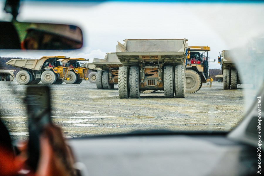 Все транспортировки породы с карьера в ГОК осуществляются самосвалами. У меня давно было жуткое желание увидеть вблизи такую махину, а также залезть в кабину и посмотреть, как все там устроено. Так я познакомился с одним из водителей, с кем удалось пообщаться. Рассказываю, что разузнал