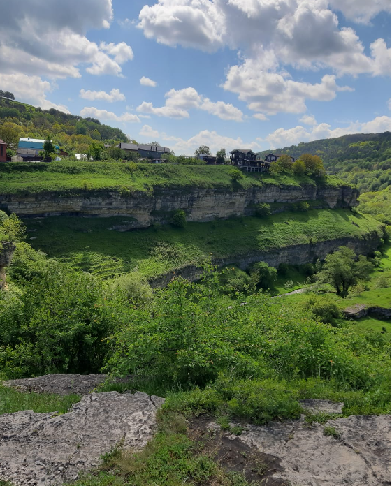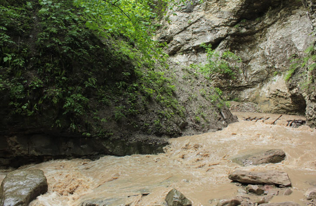 По автобусам и едем в Хаджохскую теснину. Каньон, глубиной 40 метров, вдоль которого можно бродить и любоваться пейзажем с разных ракурсов. Тут даже пасмурная погода не во вред (только надо осторожнее спускаться, чтобы ненароком не подвернуть ногу). Сбрызнутая дождем растительность выглядит как тропический лес.