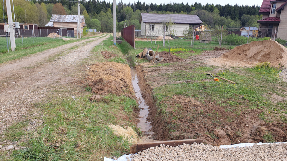 В прошлые выходные я хотел совершить трудовой подвиг и сделать на участке въезд через канаву. Она как раз просохла, и все вырисовывалось как нельзя лучше. Но дожди спутали все планы. Мало того что не сильно комфортно работать в дождь, так еще и канава вновь заполнилась водой.